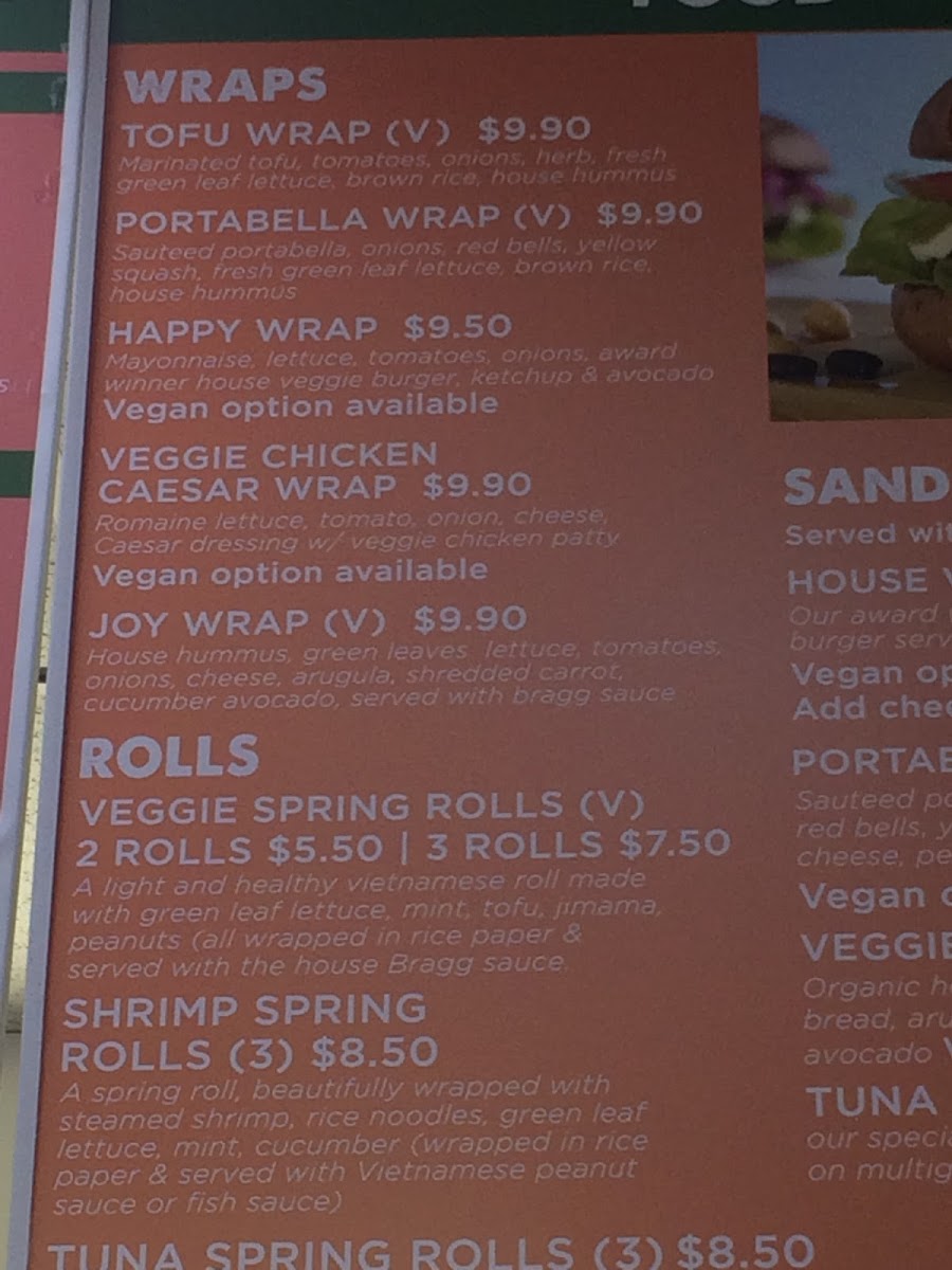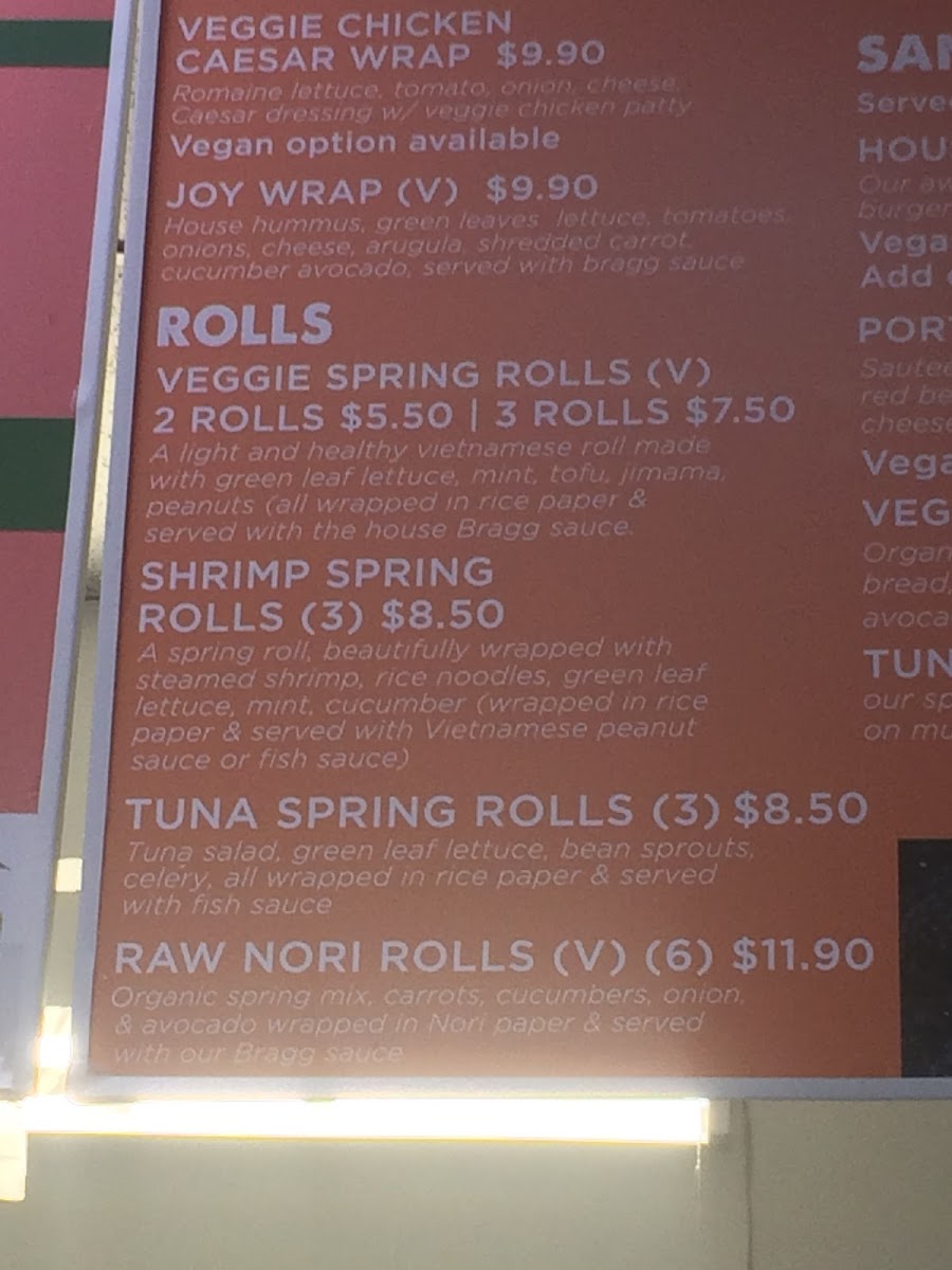 organic spring mix, carrots, cucumbers, onion, and avocado wrapped in nori paper and served with our bragg wasabi sauce. for an additional roll, add $2.50